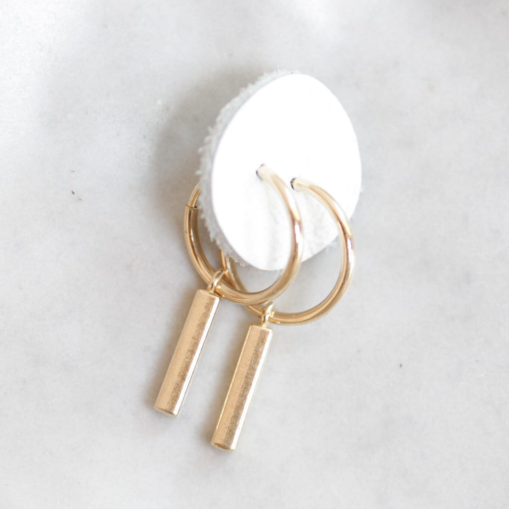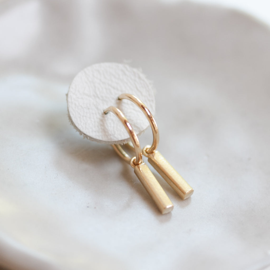 MannaSolid 14 karat gold, Infinity Hoops hold two petite, gold bars. The perfect staple earrings, or lovely layering pieces for secondary piercings. Infinity hoops can be left in comfortably, as there are no backings. Sold as a pair.