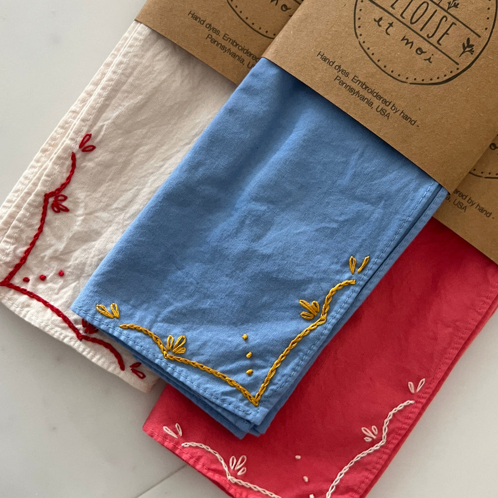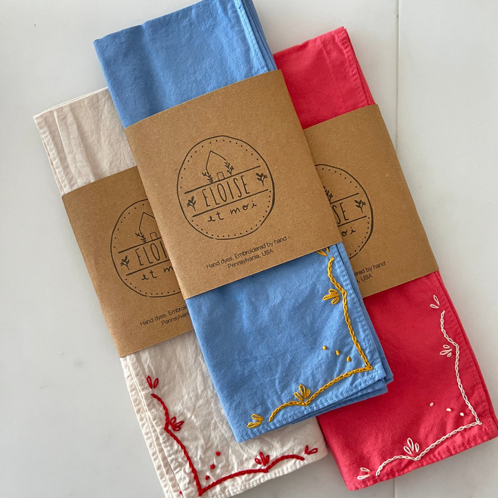 MannaDied by hand in small batches in New Mexico using NON toxic dyes and natural dyes. Made in a sturdy premium cotton. Featuring a bigger embroidery edge on one side and little details in 2 more sides. Each one is one of a kind and different from the others as they are embroidered and dyed by hand.