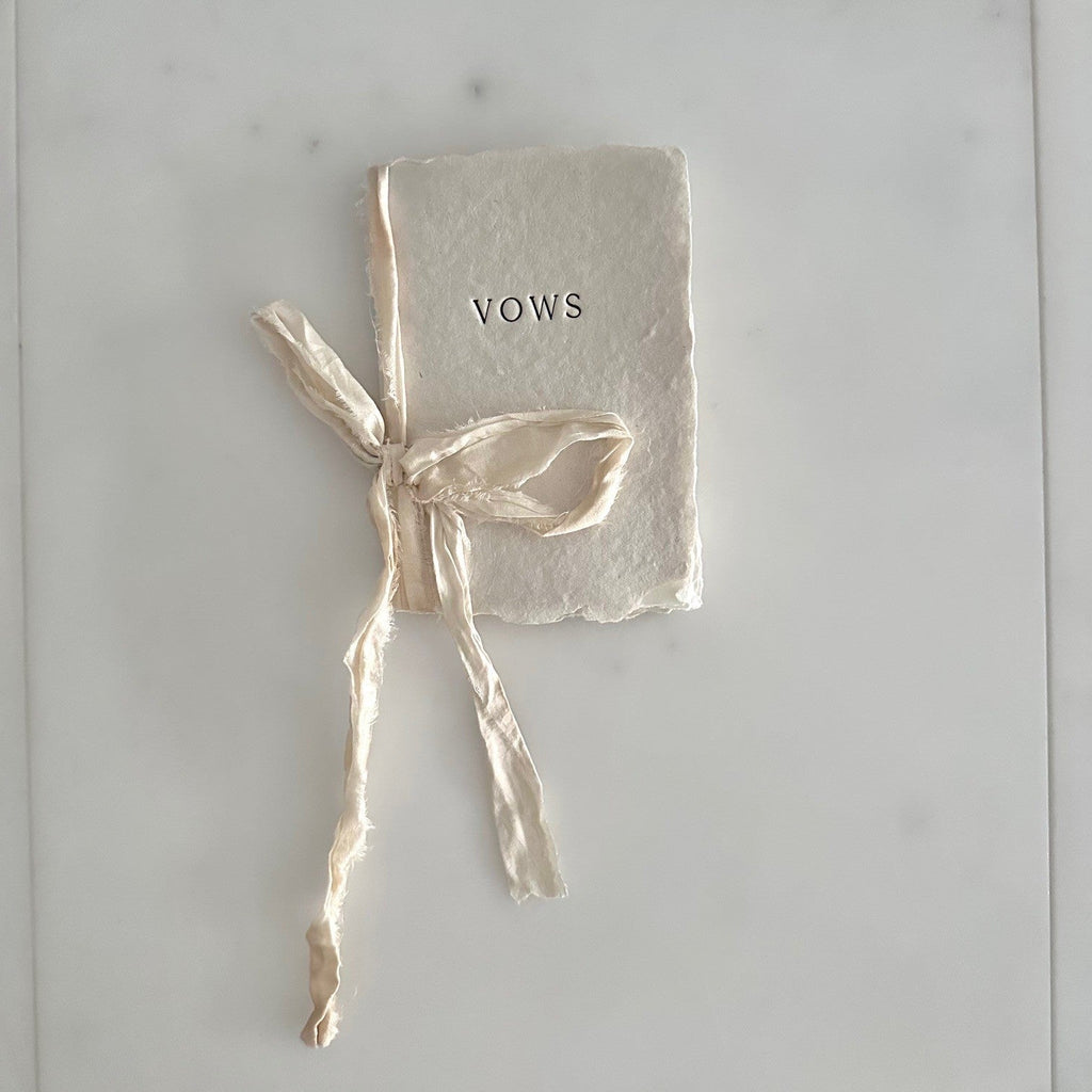 Each vow book is made in Farmette's California studio, with the cover paper and letterpress handmade by us and the twelve interior pages made by artisans in India. Tied with 100% silk ribbon sewn in India and botanically-dyed in their California studio.