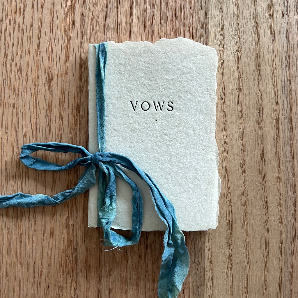 Each vow book is made in Farmette's California studio, with the cover paper and letterpress handmade by us and the twelve interior pages made by artisans in India. Tied with 100% silk ribbon sewn in India and botanically-dyed in their California studio.