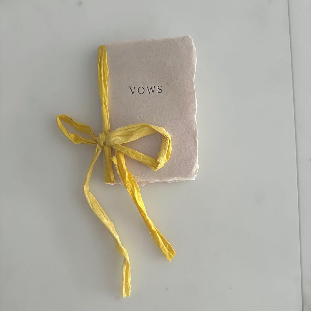 Each vow book is made in Farmette's California studio, with the cover paper and letterpress handmade by us and the twelve interior pages made by artisans in India. Tied with 100% silk ribbon sewn in India and botanically-dyed in their California studio.