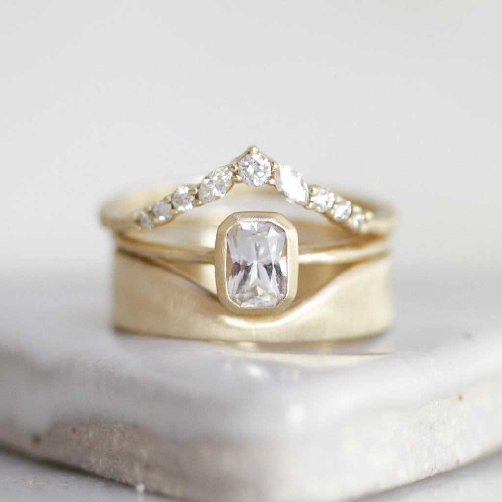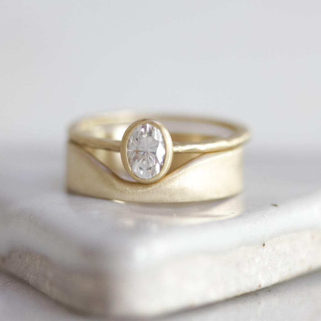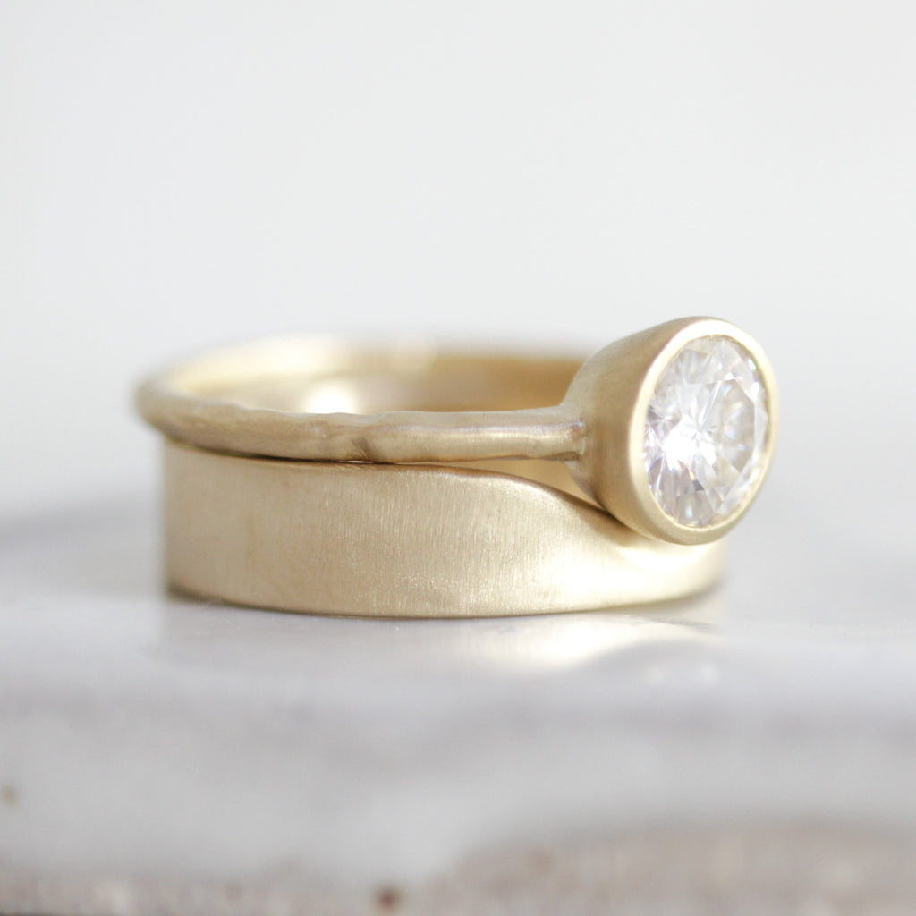 MannaA 5mm band of warm solid 14k gold envelops around your favorite solitaire, creating a safe haven. Made to stack, leaving you room to create your own stunning and unique wedding set. Every ring, subtly one of a kind due to its handmade nature.