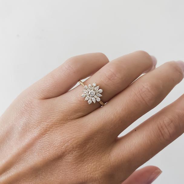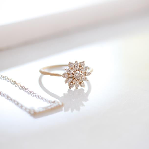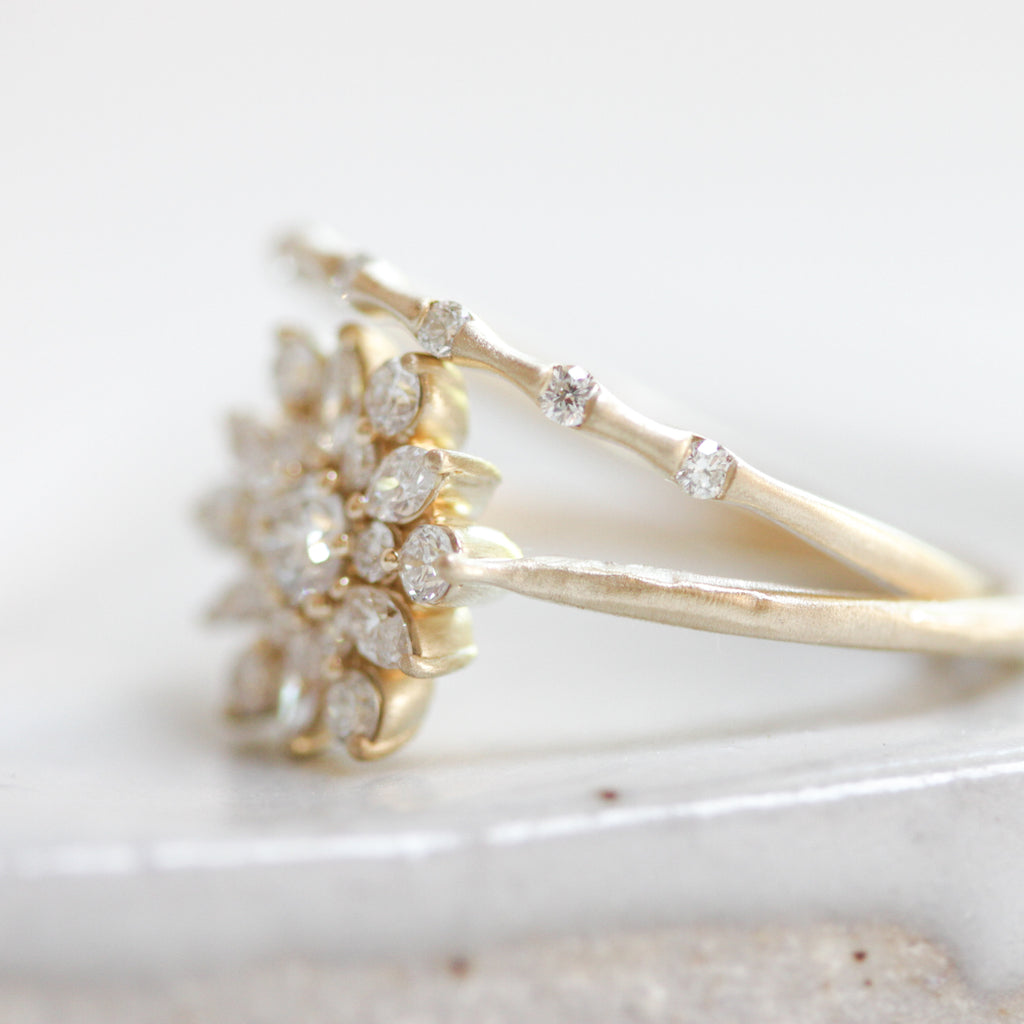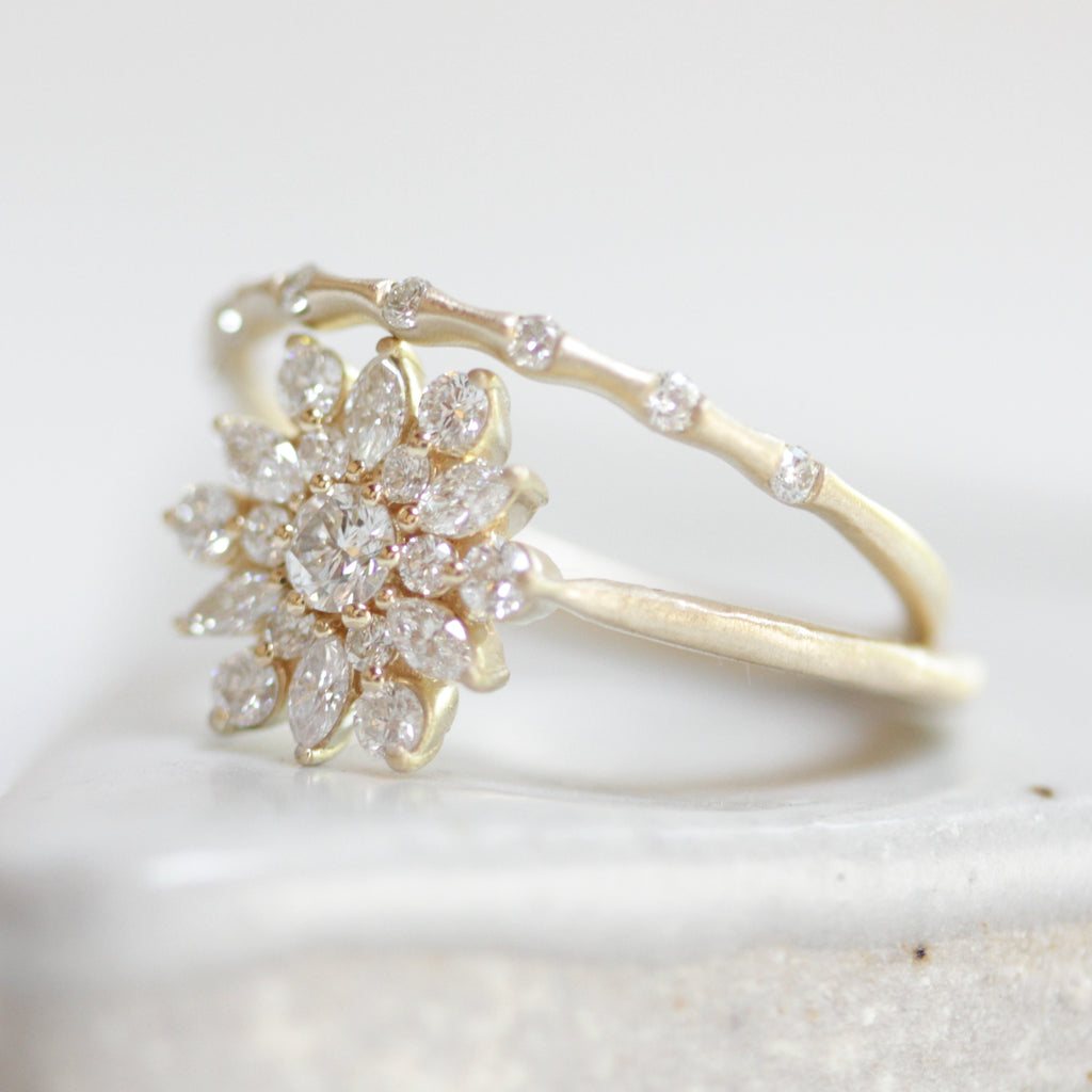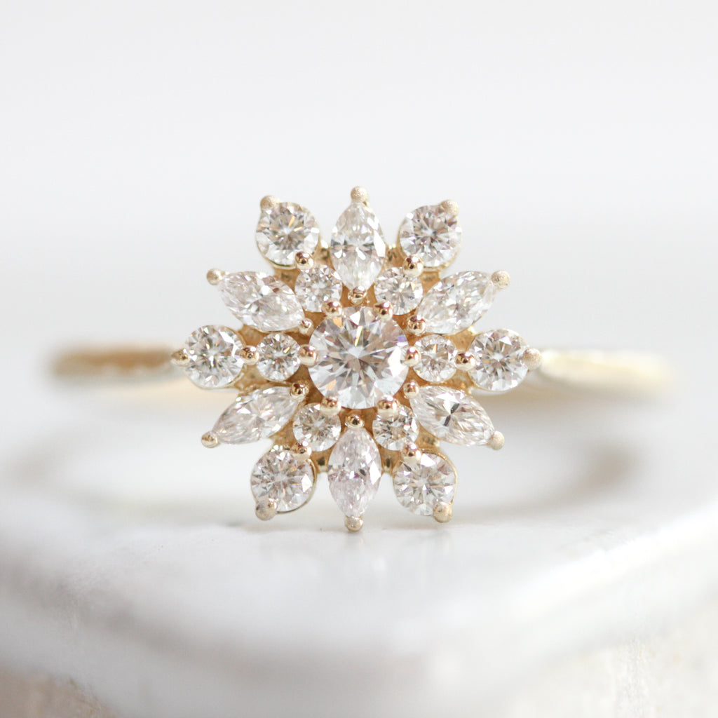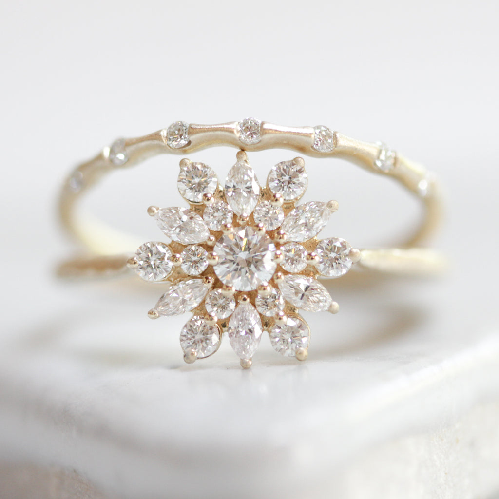 MannaBrilliant, round and marquise Diamonds form an intricate halo around a 3mm round center Diamond, creating a beautiful flower or snowflake design. Hand carved, organic gold band or a smooth and sleek gold band. Solid 14 karat gold.