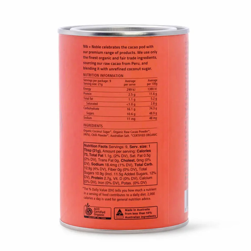 Ingredients: Coconut Sugar*, Cacao Powder* (46%), Chili Powder*, Himalayan Salt. *Certified Organic.