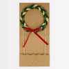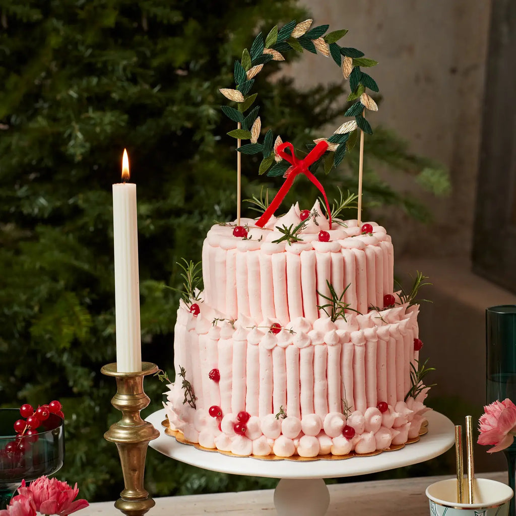 MannaPaper leaves are crafted from dark green, mid green and light gold crepe paper. Has a red velvet ribbon bow and natural bamboo skewers for easy insertion into the cake.